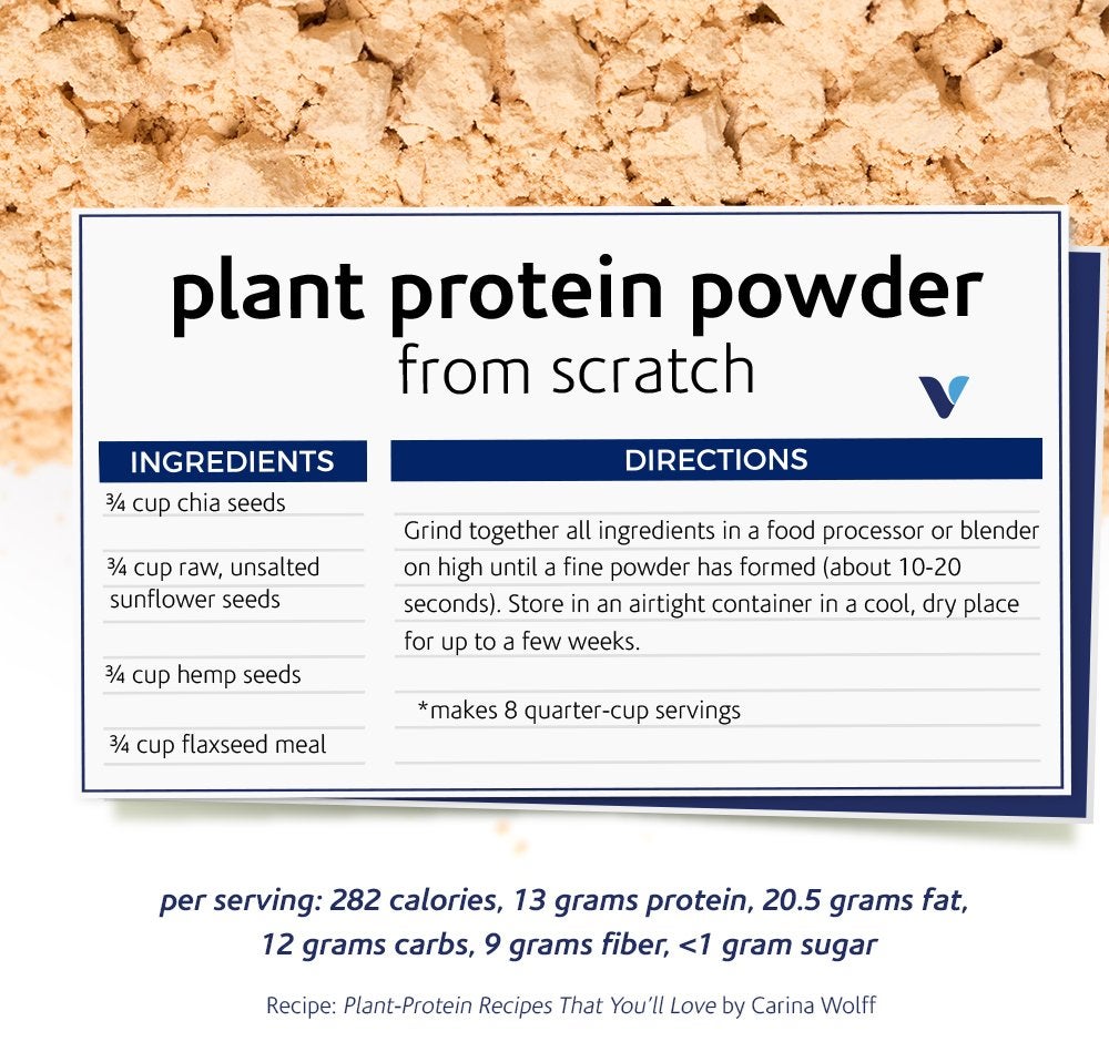 “Making your own protein powders at home helps you control what goes inside, and allows you to have a wider variety of nutrients,” says Carina Wolff, author of Plant-Protein Recipes That You’ll Love. For healthy fats plus plant protein, try her seed-based recipe. It works best when added to hearty dishes, such as soups, sauces, and baked goods.