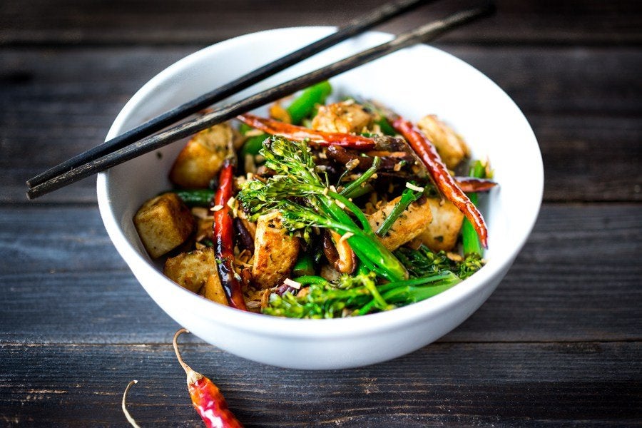 The whole thing takes about 20 minutes flat. Just add a sprinkle of chopped cashews or peanuts into the mix for extra crunch. Plus, carnivores can easily swap thinly-sliced chicken breast for tofu.
