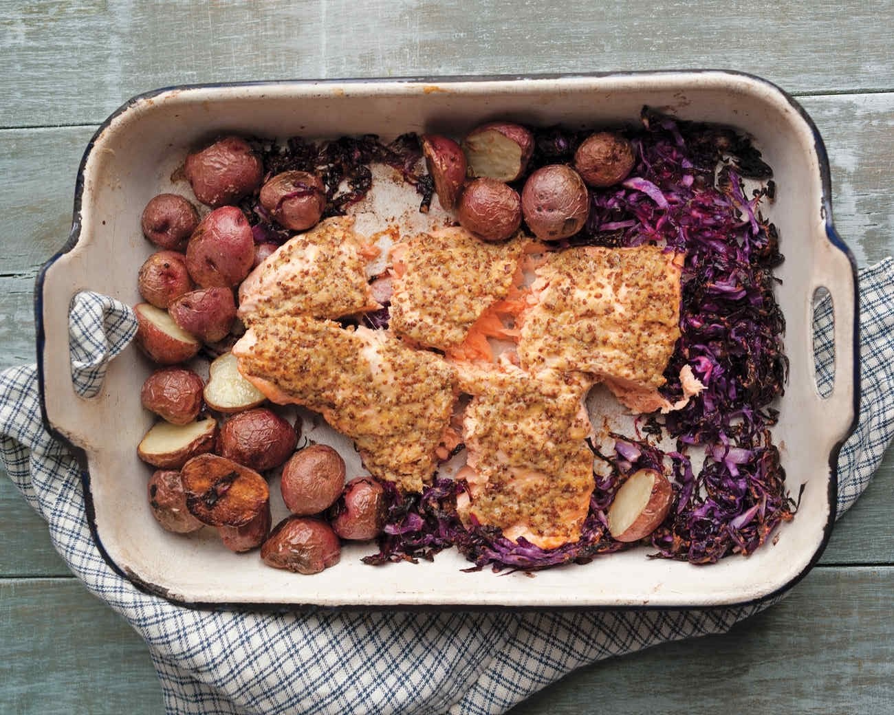 Preheat your oven to 400 degrees and grab a baking dish to make this flavor-packed salmon dinner by Martha Stewart. “The cabbage provides tons of nutrition, including fiber, antioxidants, vitamins, and minerals, and salmon is my favorite protein of all time,” says Brooke Alpert, R.D., who makes this delish dinner all the time. Plus, the healthy fats in salmon support everything from skin and heart health to mood, she adds.