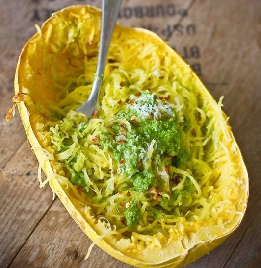 This easy-peasy recipe from Sweet C’s Designs is the perfect veggie-based solution for pasta cravings. Spaghetti squash, olive oil, garlic, pesto, and Parmesan cheese make for a satisfying, healthy swap. “This dish is loaded with healthy fats, antioxidants, and fiber, is low-calorie, and guaranteed to be sweet, filling, and delicious—with minimal clean up!” says Shapiro.