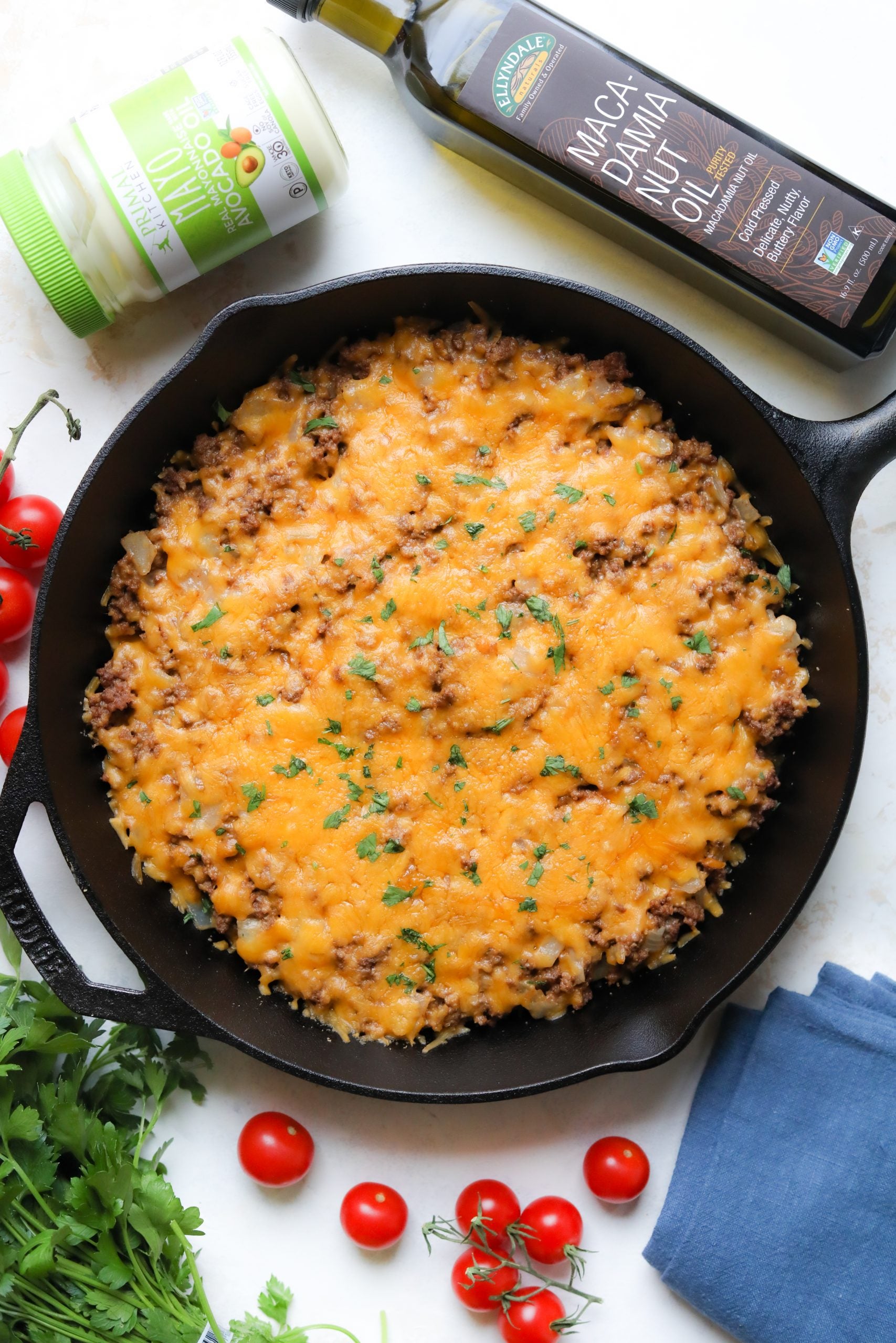 Burger night just got a major upgrade with this Keto Cheeseburger Skillet. Made with ground beef, sharp cheddar cheese, and Primal Kitchen Foods Avocado Mayonnaise, this drool-worthy dish is best served family style!