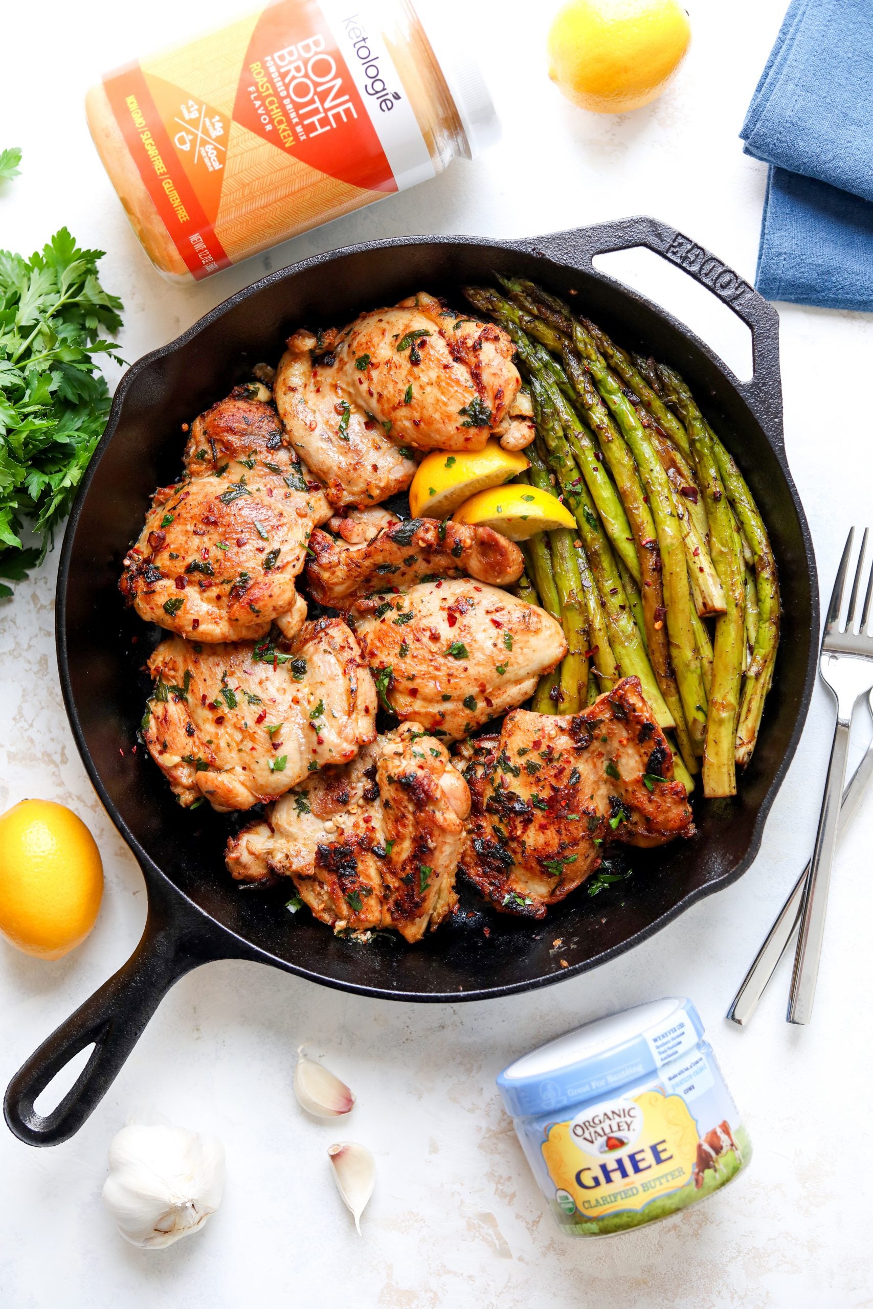 - While the chicken thighs are cooking, add the asparagus to a microwavable safe bowl, along with a 1/2 cup of the water, and microwave for around 5 minutes (straining afterward). Once the chicken is cooked, remove it from the skillet and add the remaining ghee. While the ghee is melting, add the Ketologie Bone Broth to the remaining water and mix well with a whisk. Pour into the skillet and reduce the sauce down.