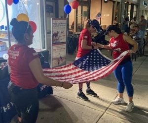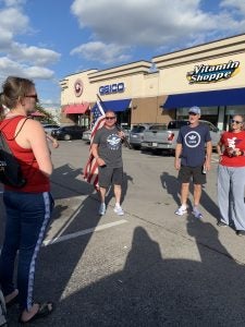 Erin Hicks, Senior District Sales Manager at The Vitamin Shoppe, and Paul and Sandy Sklar, who own a Charlotte gym and are top-tier fitness influencers with Optimum Nutrition, running the Old Glory Flag towards The Vitamin Shoppe pit stop.
