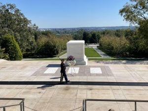 Arriving at Arlington National Cemetery to take part in a wreath-laying ceremony honoring fallen American soldiers.