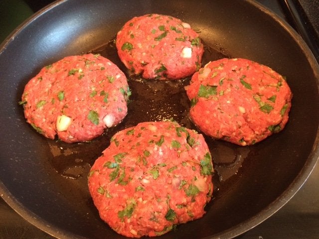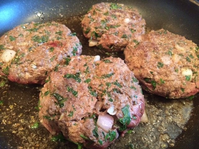 Then, heat up the olive oil in a large sauce pan on the stove over medium heat. Place your patties and brown each side—about two to four minutes each.