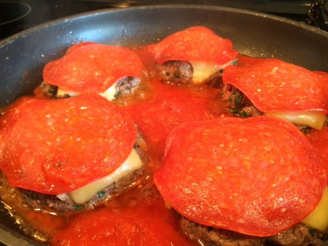 Reduce heat to medium-low, and add the marinara sauce. Let the burgers continue to cook in the sauce for five more minutes on each side.