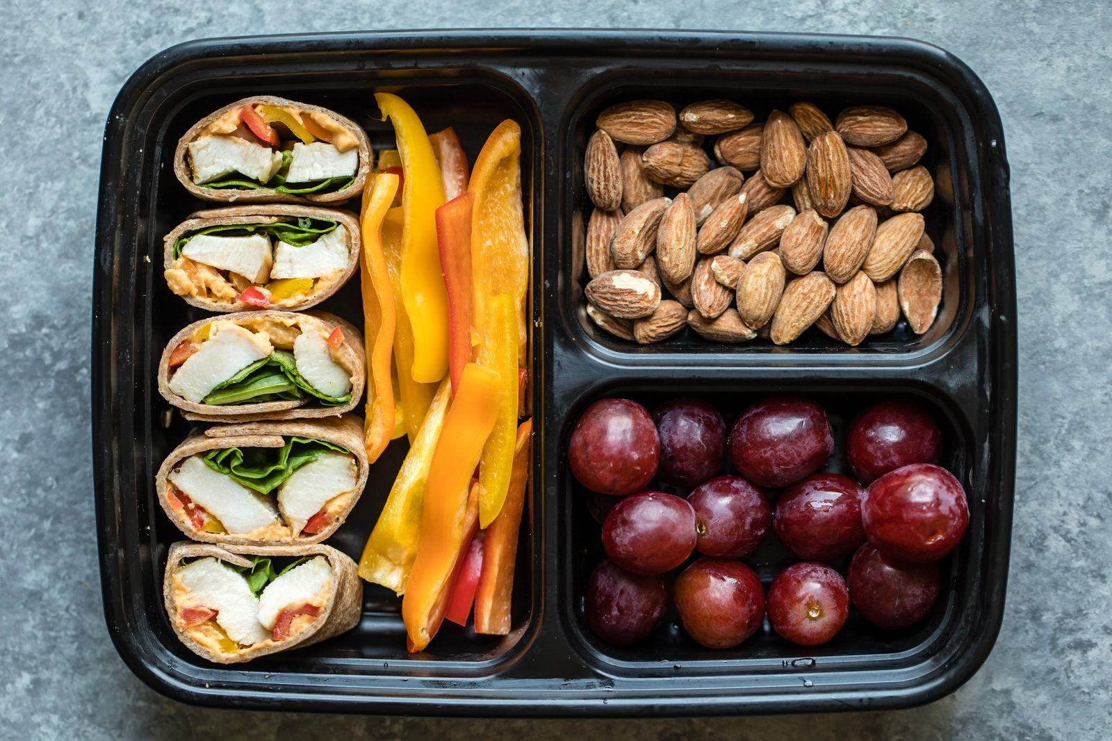 The mix-and-match meals all include a source of healthy fats, a protein, some complex carbs, and a couple of fruits and vegetables, providing a variety of nutrients and flavors. “Different combinations of foods could include hard boiled eggs, raw sliced veggies, grilled chicken, tuna, smoked salmon, fruit, whole grains, cheeses, crackers, and nuts,” suggests Kubala.