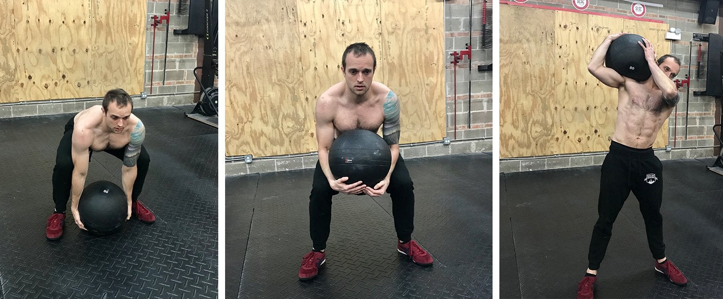 If needed, drop your hips back down into a squat to get under the ball so you can push it up over your shoulder. Otherwise, the ball should have enough momentum to roll up your chest and back over your shoulder. Repeat, but chuck the ball over your other shoulder this time.