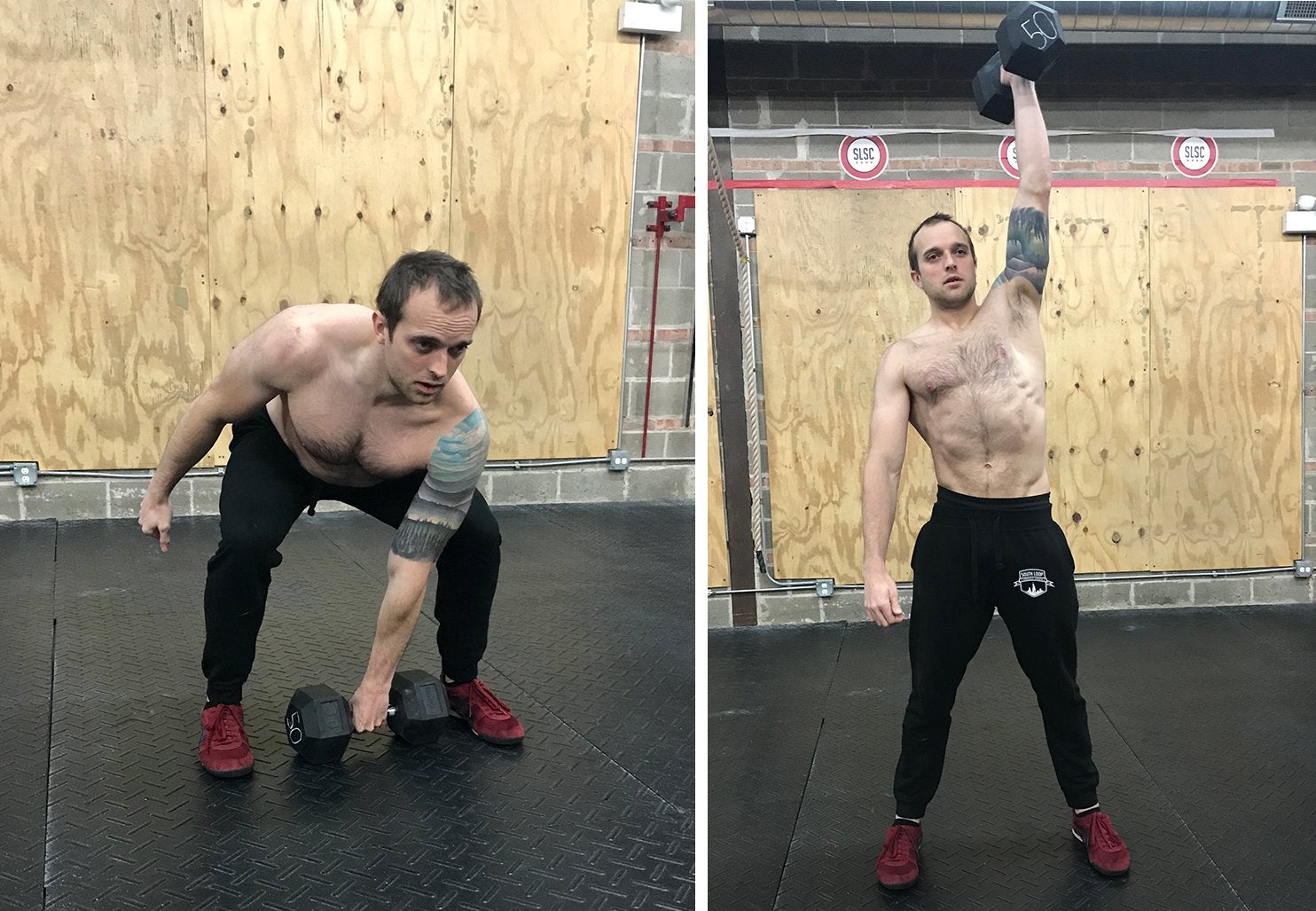 How to do it: Stand with a dumbbell between your feet and drop your hips down to grab it with one hand. Keep your chest up and spine neutral. Then, push through your legs to lift the dumbbell off the floor. As you pull the dumbbell upward, extend your hips and let your elbow bend so you can press the dumbbell straight up overhead when it reaches shoulder-height. Finish in a stable standing position with the dumbbell extended up over your head. Lower it back down and repeat on the other side.